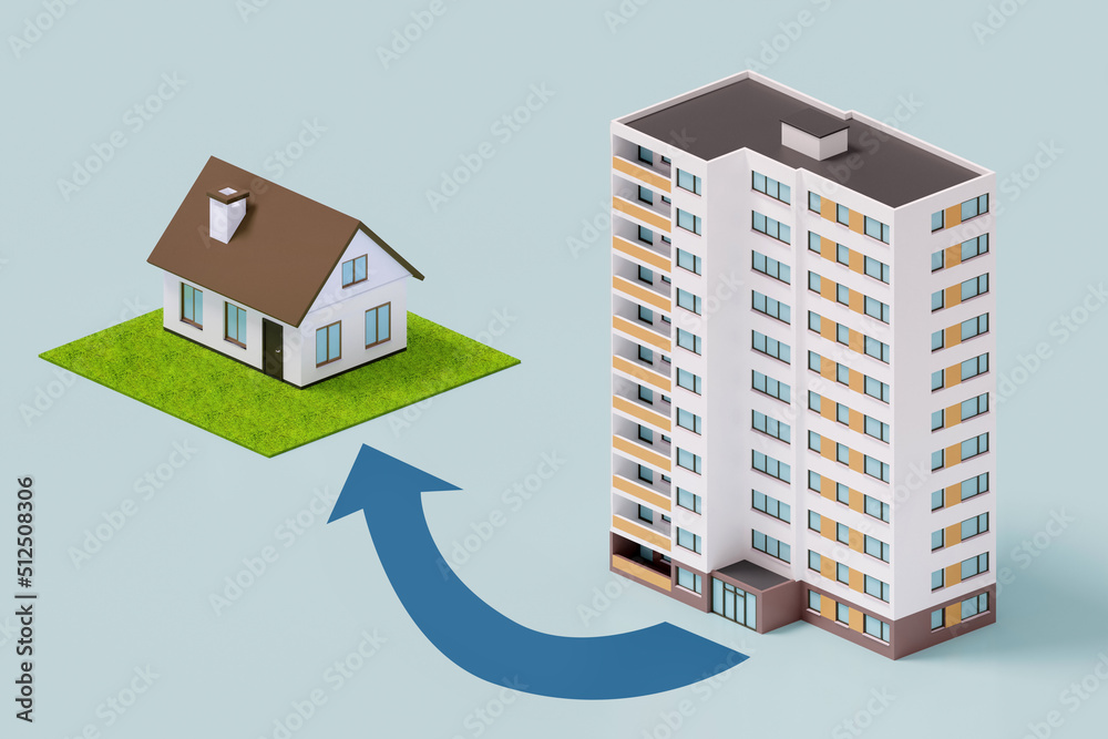 Relocation from apartment building to cottage concept - 3d rendering ...