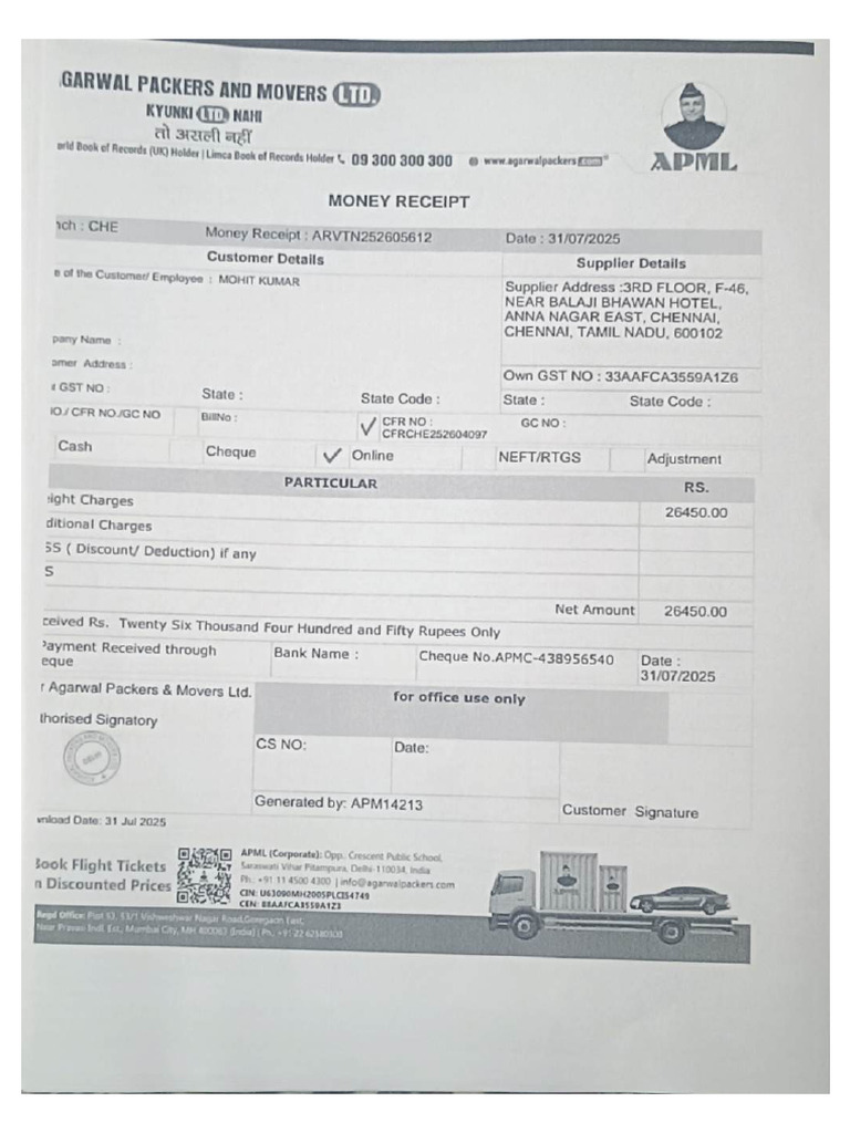 Packers and Movers Bill For Claim JMD Packers and Movers India