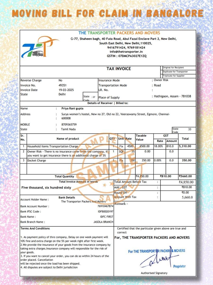 Verified Packers and Movers Bill for Insurance Claim in Bangalore