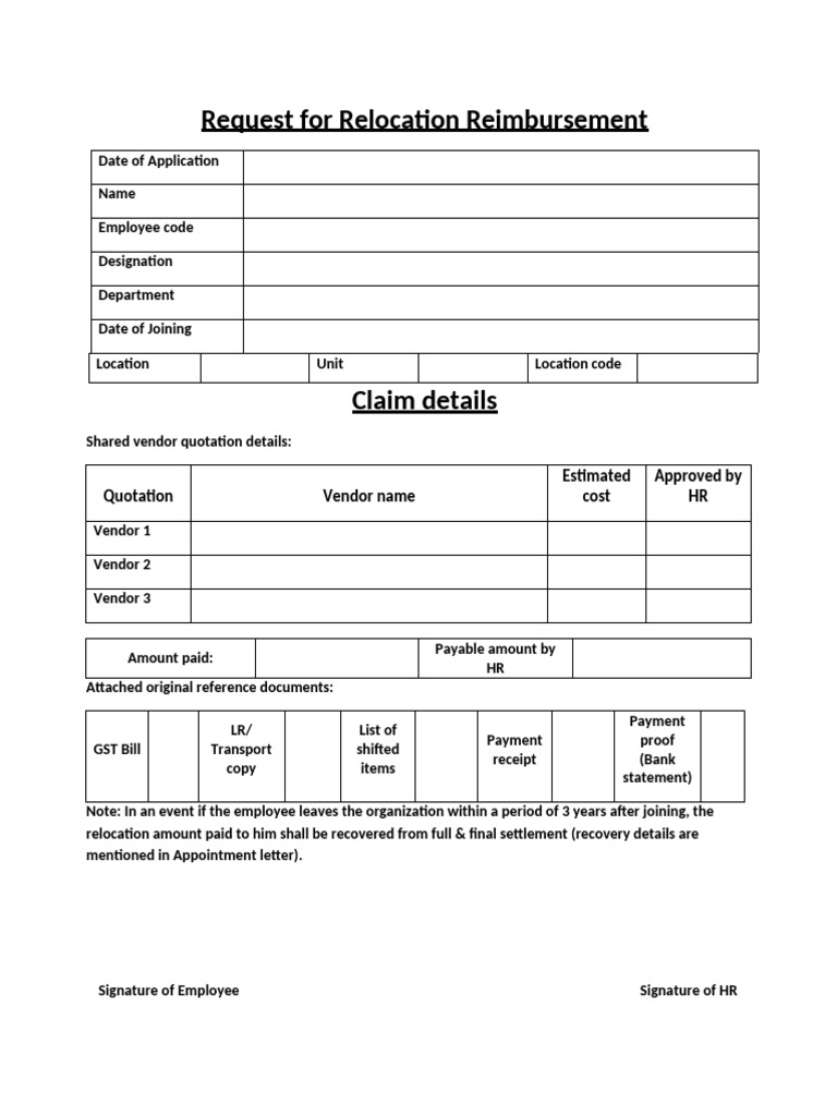 Relocation Reimbursement Form HR Template in Word, PDF, Google Docs ...