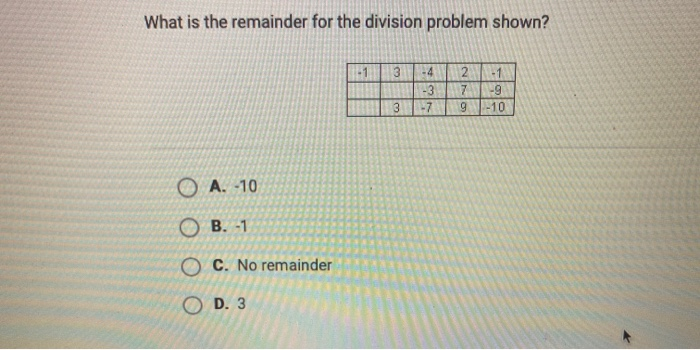 Solved What is the remainder for the division problem shown? | Chegg.com