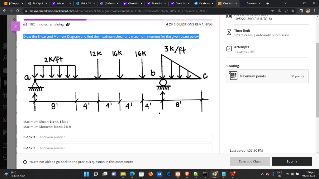 Solved (5) 102 minutes remaining 《 Time limit Draw the Shear | Chegg.com