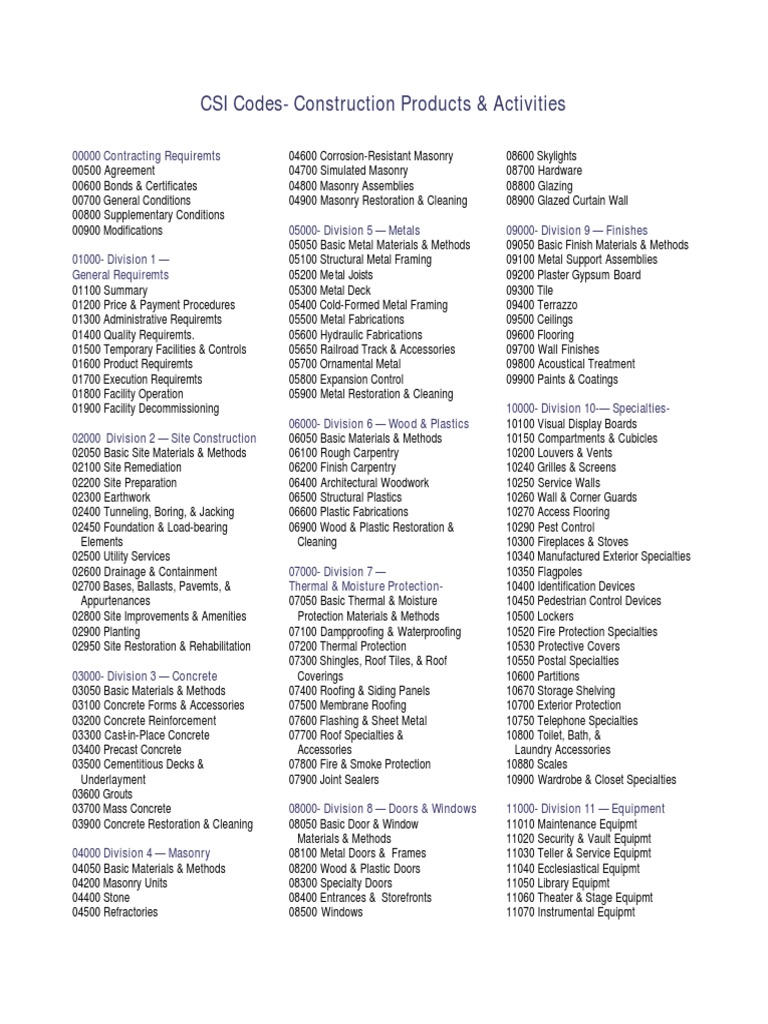 CSI Codes - Specialty Detail: Division 1 - General Requirements | PDF ...
