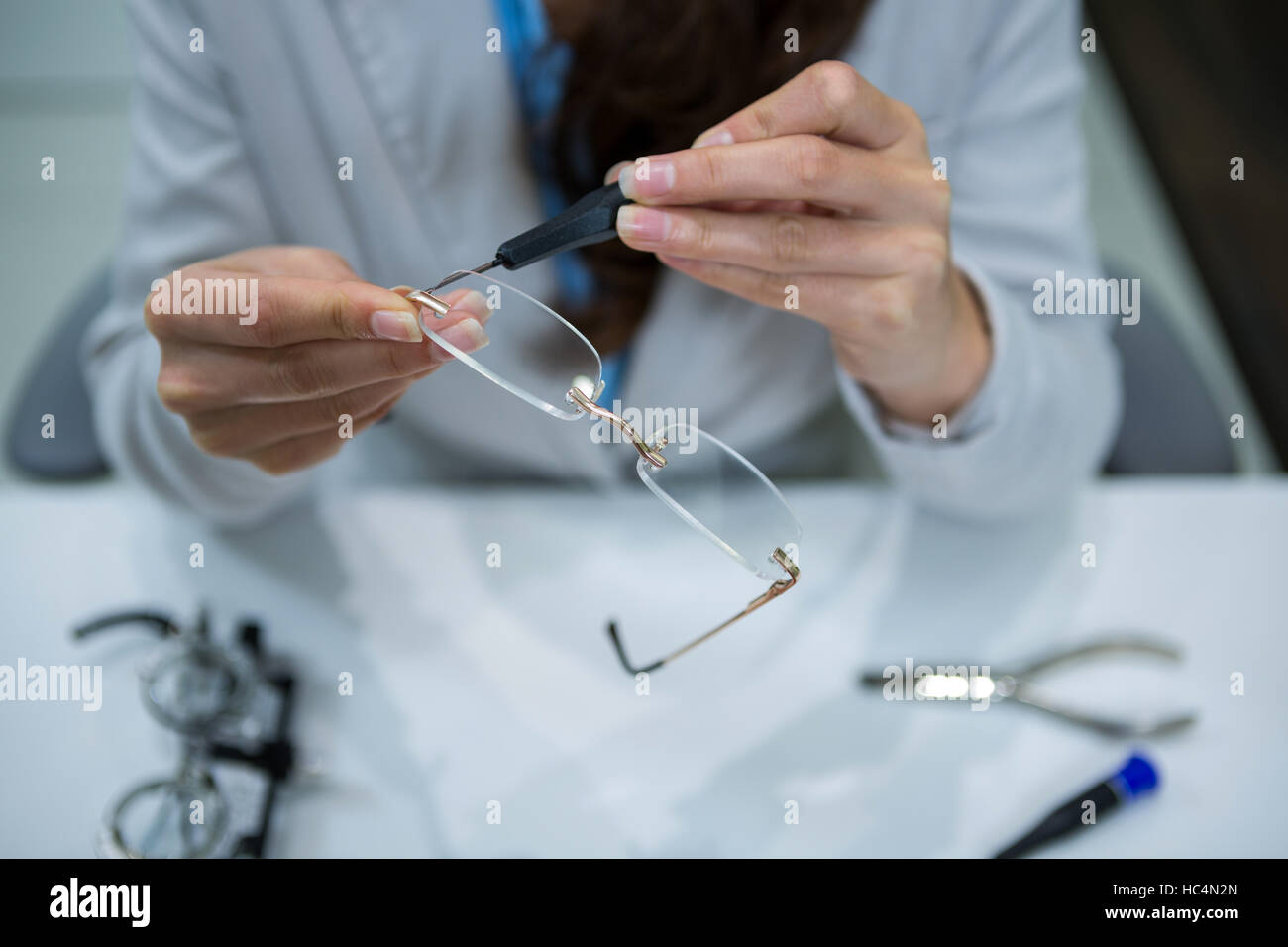 Optician repairing spectacles with tool Stock Photo - Alamy