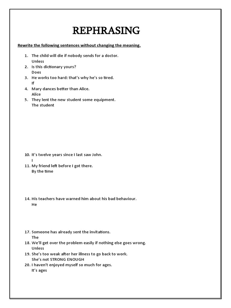 REPHRASING sentence transformation,…: English ESL worksheets pdf & doc