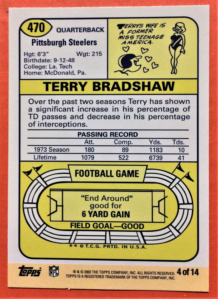 TERRY BRADSHAW 2002 TOPPS REPINT COMMEMATIVE SERIES # INSERT 4OF 14 ...