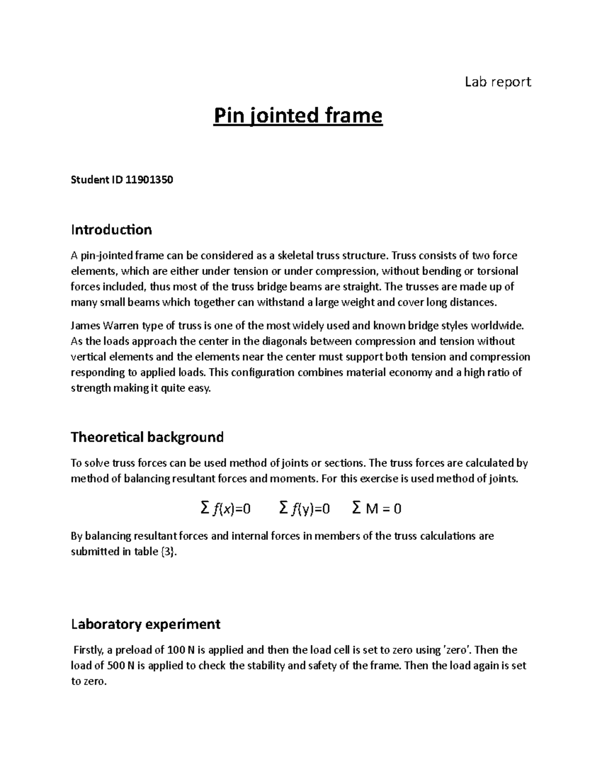 Lab Report - Pin Jointed Frame Analysis (ID 11901350) - Studocu