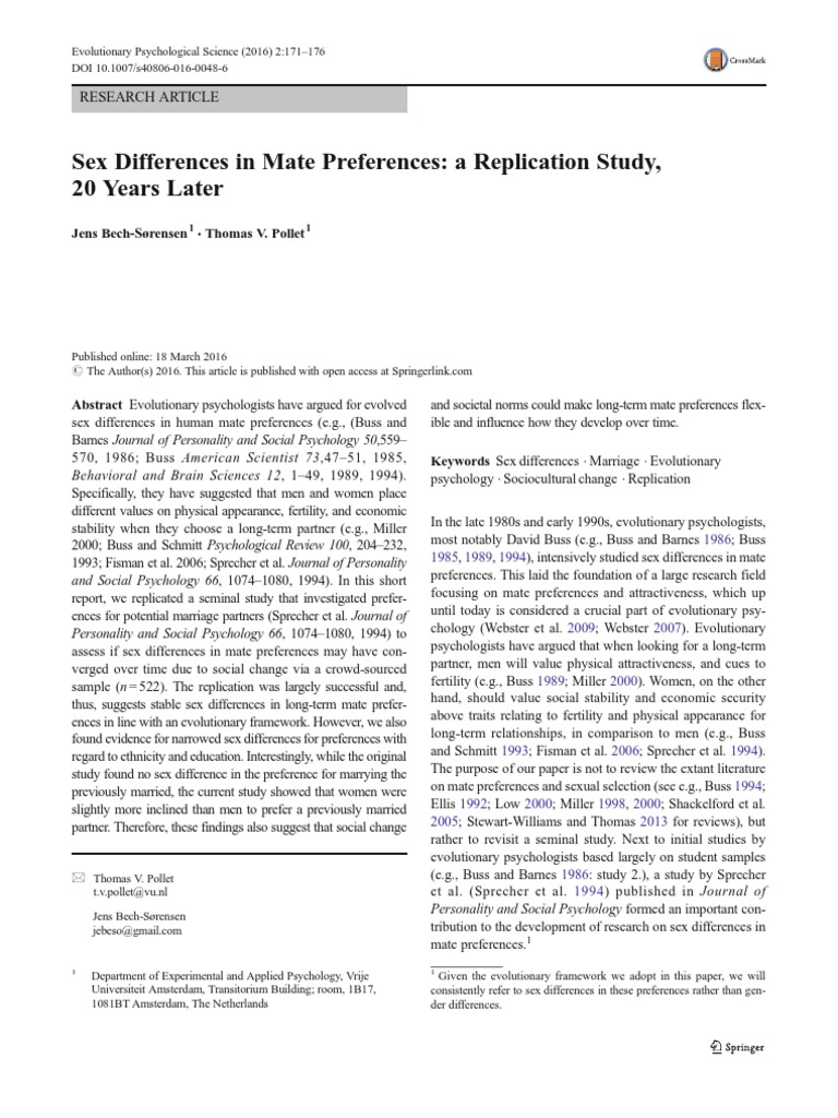 Sex Differences in Mate Preferences: A Replication Study, 20 Years ...