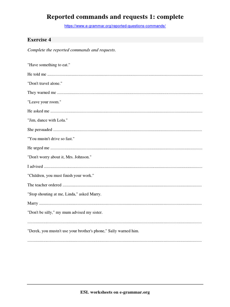 English Practice - Reported Commands: Finish The Sentences Using ...
