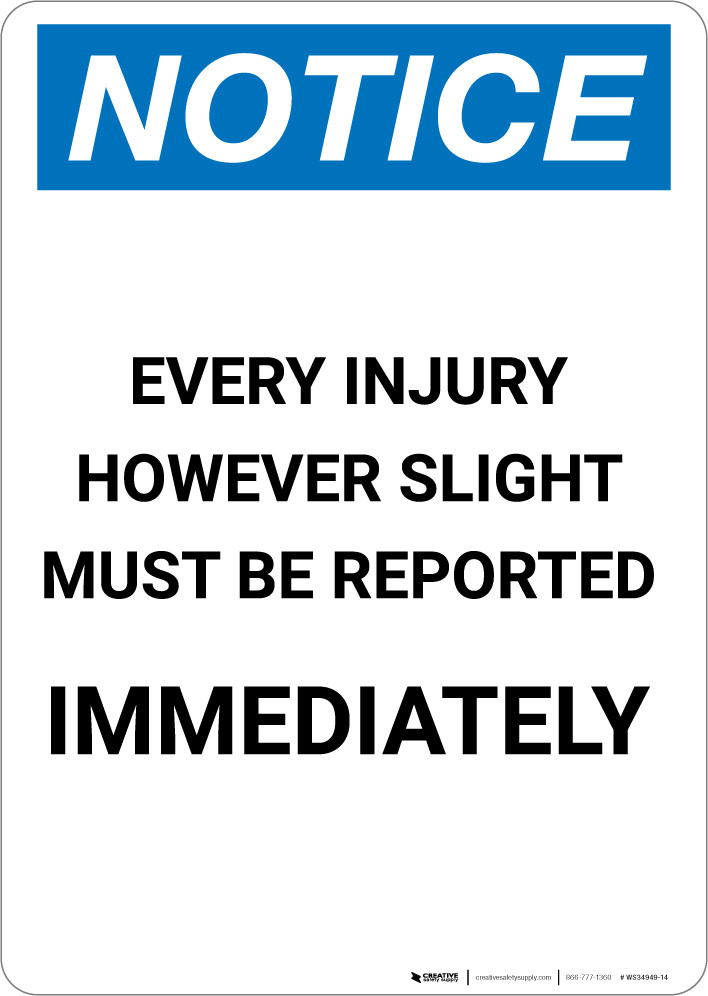 Notice: Every Injury Must Be Reported Immediately - Portrait Wall Sign