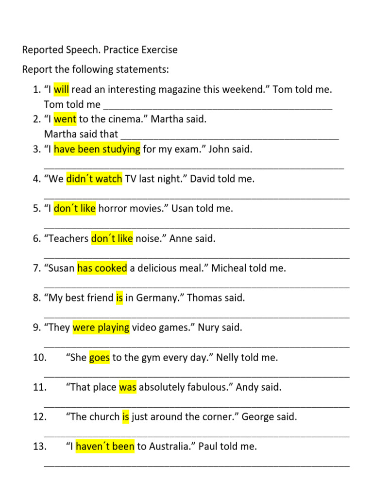 Reported Speech Worksheet & Exercises with PDF (Free Download) • 7ESL