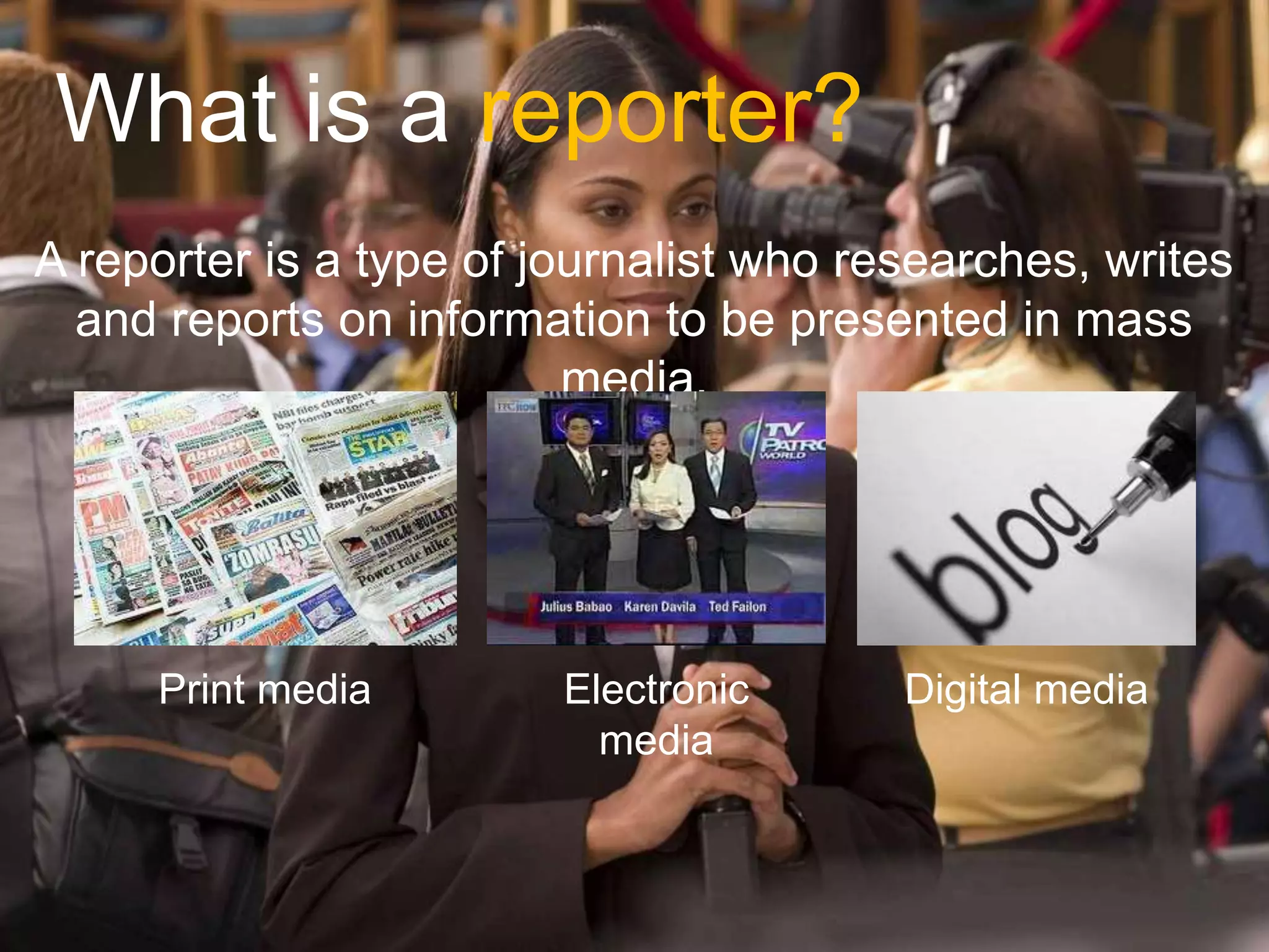 Reporter - A reporter is a type of journalist who researches and ...