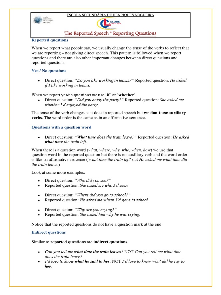 Reported Speech: Reporting Questions Guide | PDF | Foreign Language ...