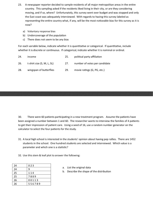 Solved 23. A newspaper reporter decided to sample residents | Chegg.com