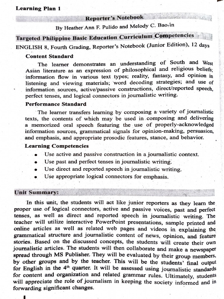 ENGLISH 8 Fourth Grading: Reporter's Notebook Learning Plan 1 - Studocu