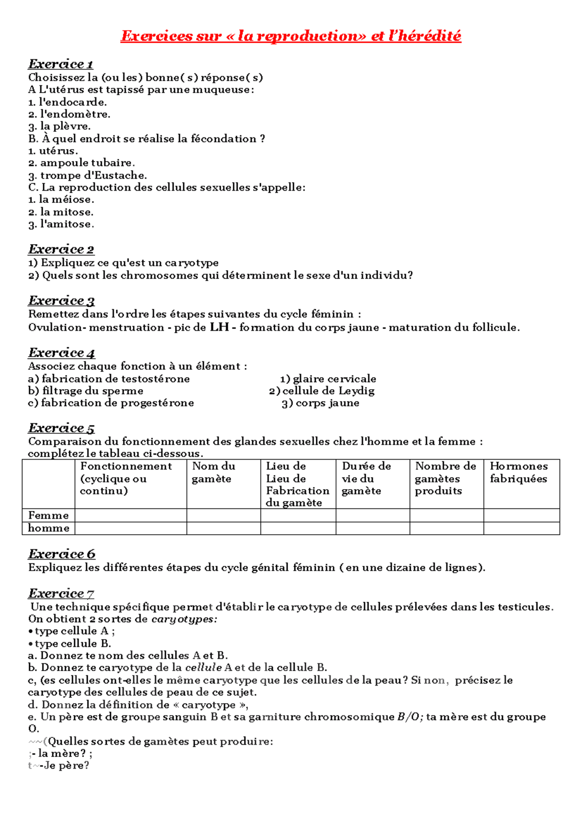 La reproduction humaine exercices SVT 2AC 1 - Exercices sur « la ...