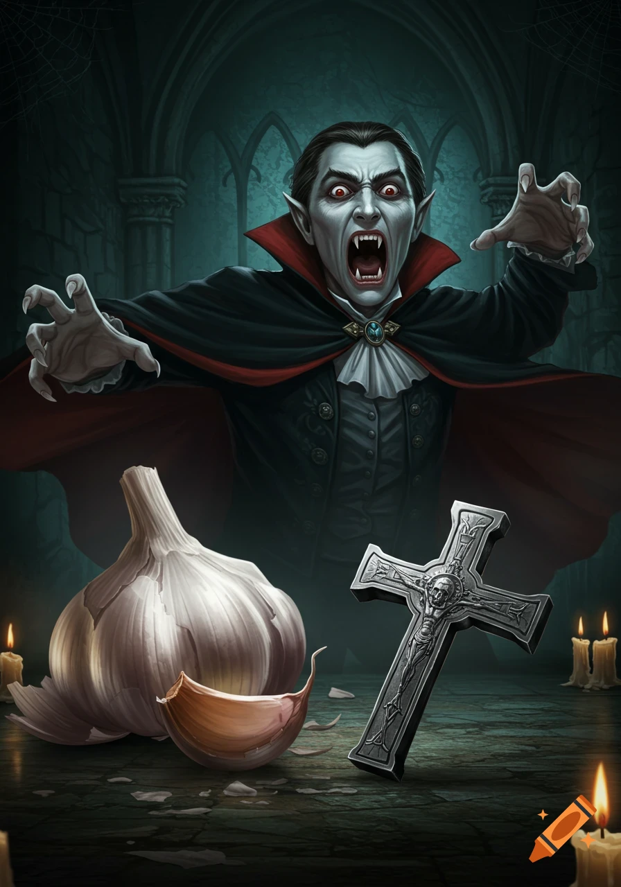 Illustrative depiction of a scared vampire recoiling from garlic and a ...