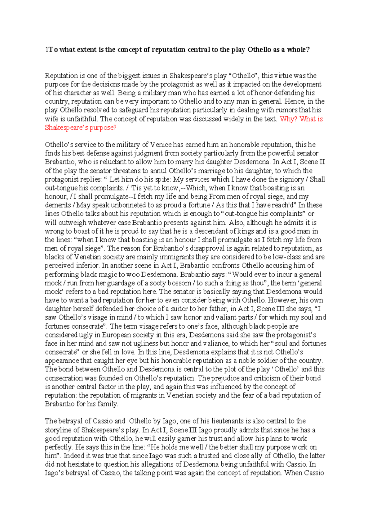Honour and Reputation in Shakespeare's Othello: An Essay Analysis - Studocu