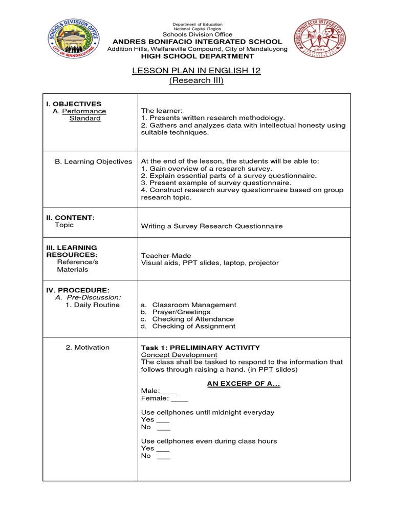 LESSON PLAN IN WRITING A RESEARCH QUESTIONNAIRE.pdf - Q LESSON PLAN IN ...