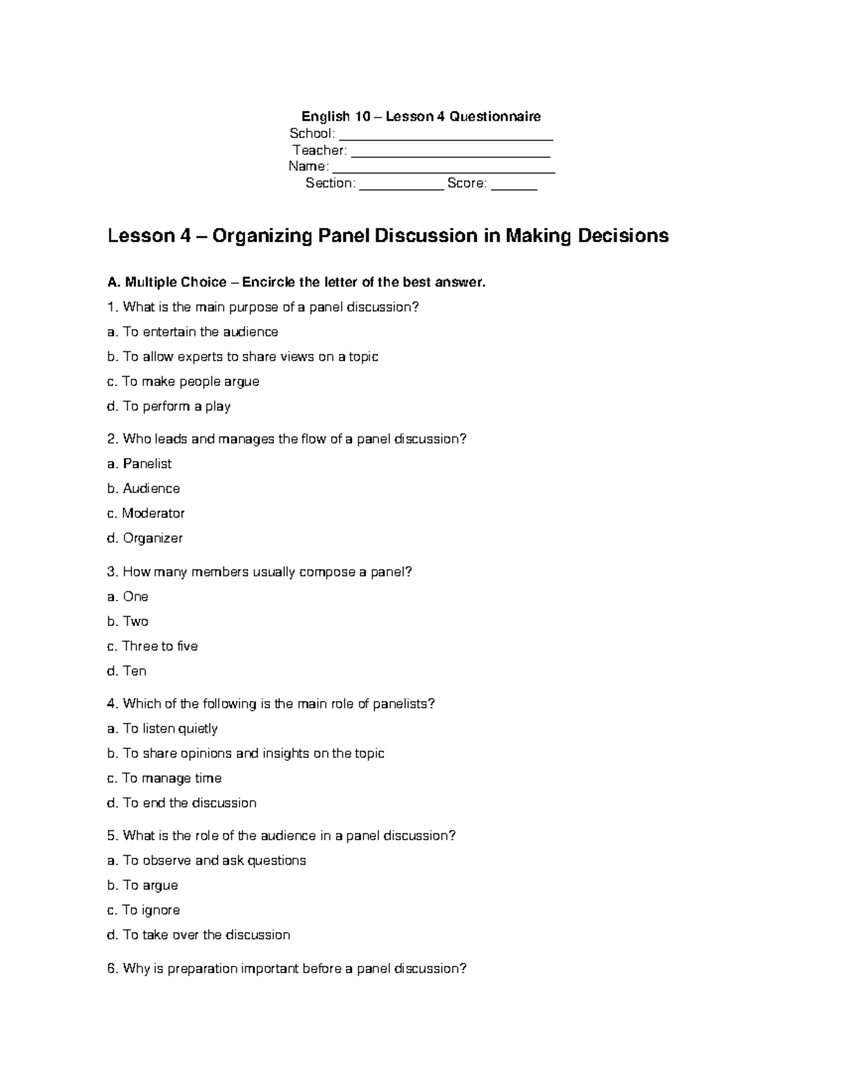 English 10 Lesson 4: Panel Discussion Questionnaire - Studocu