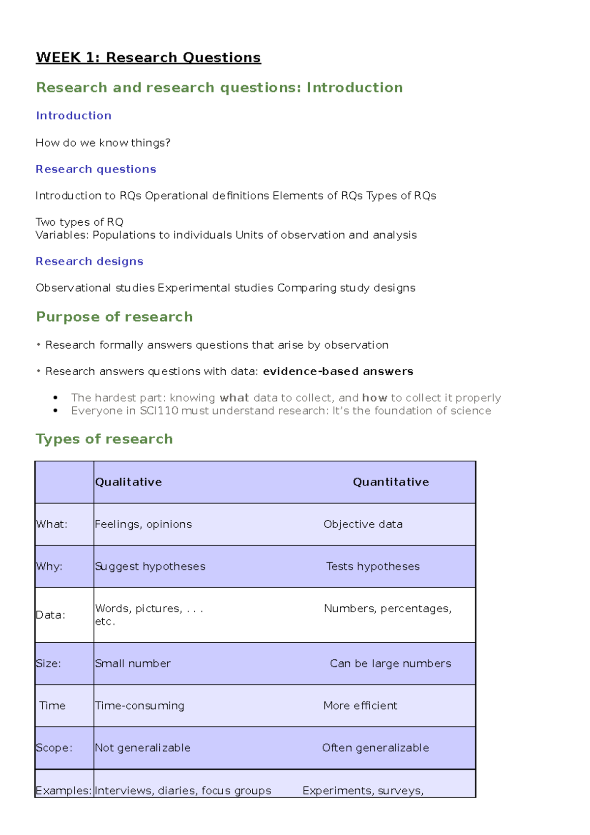 SCI110 lecture notes - WEEK 1: Research Questions Research and research ...