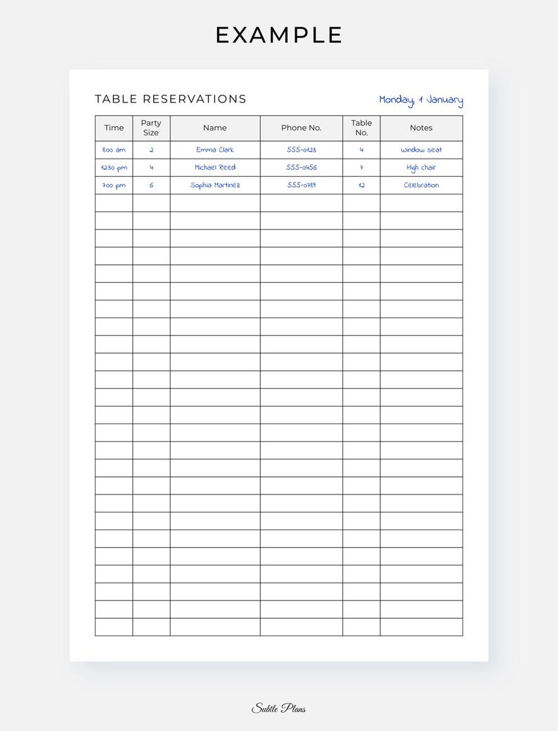 Printable Restaurant Table Reservation List (PDF & PNG) - Etsy