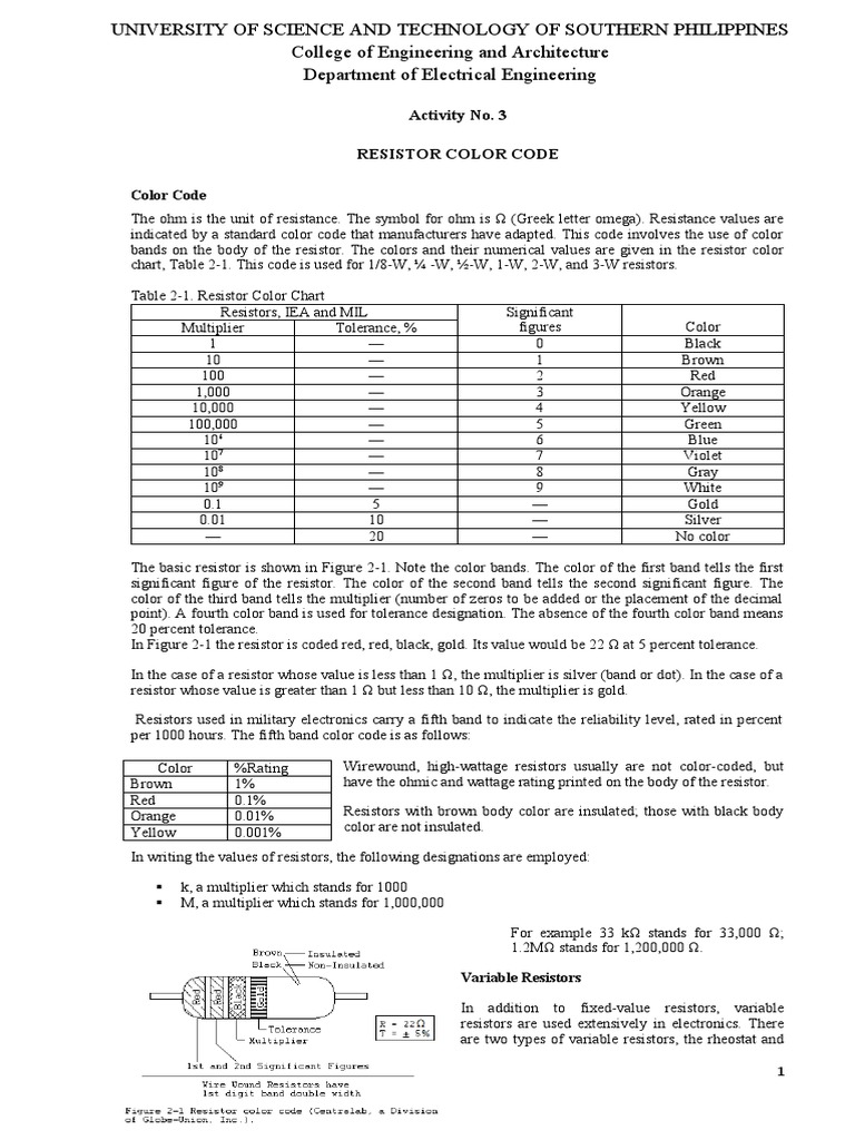 Campit - Activity 1 Resistor Color Code | PDF | Resistor | Electrical ...