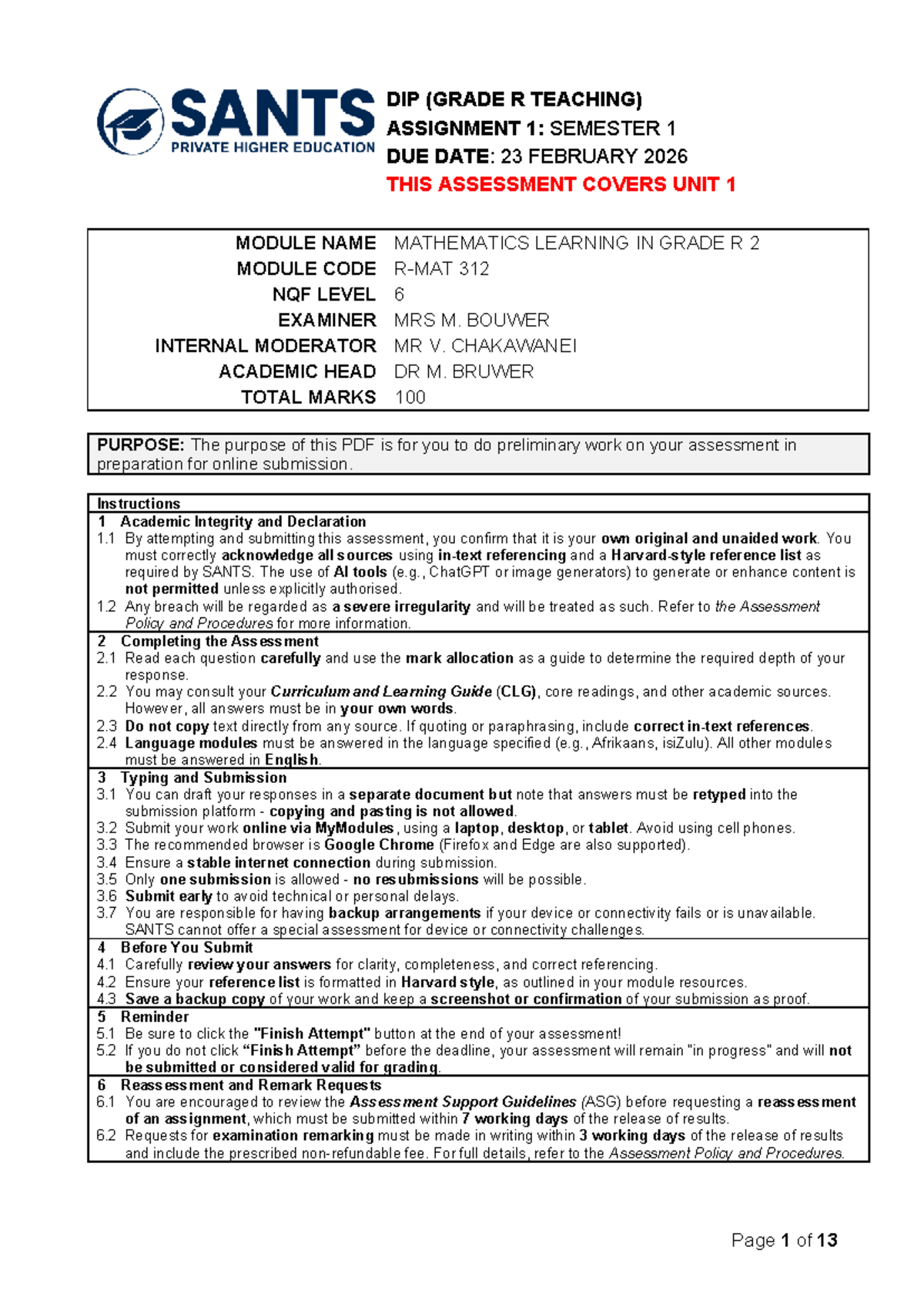 R-MAT 312 Assignment 1: Mathematics Learning in Grade R - Semester 1 ...