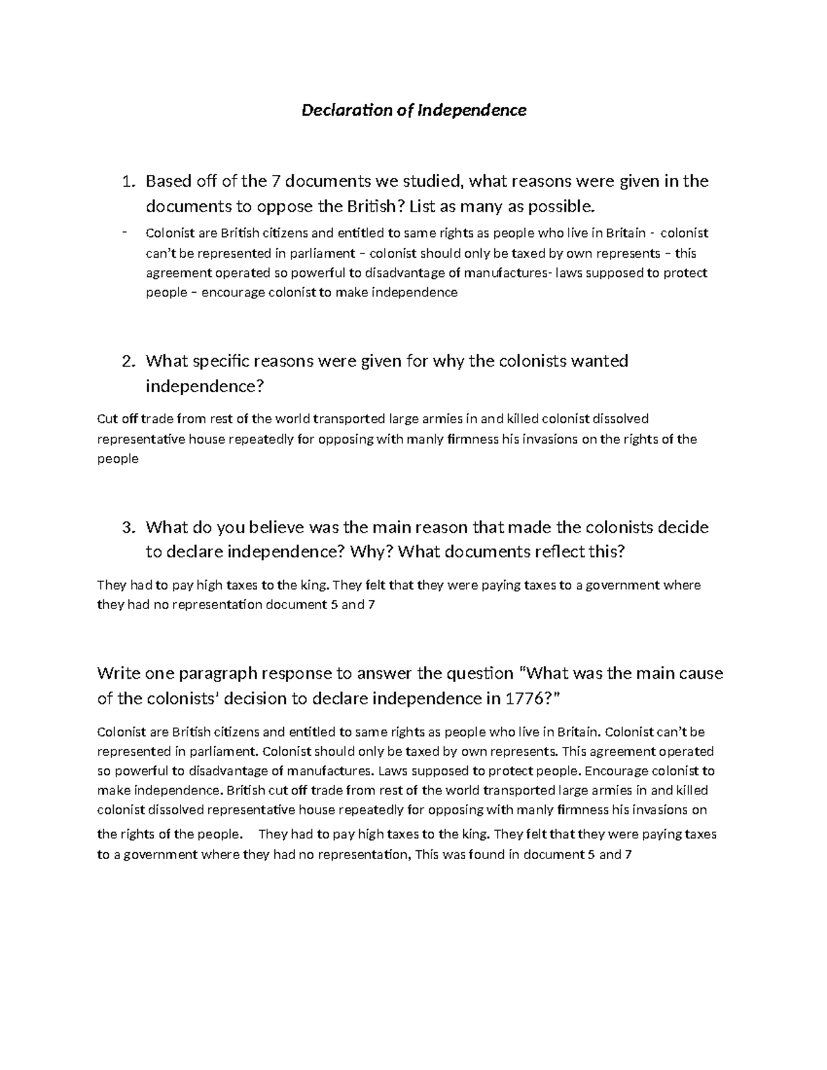 Declaration of Independence response - Declaration of Independence 1 ...