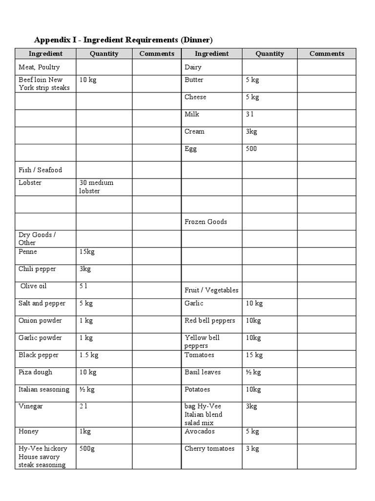 Dinner Ingredient Requirements & Adjustments | PDF | Kitchen Utensil ...