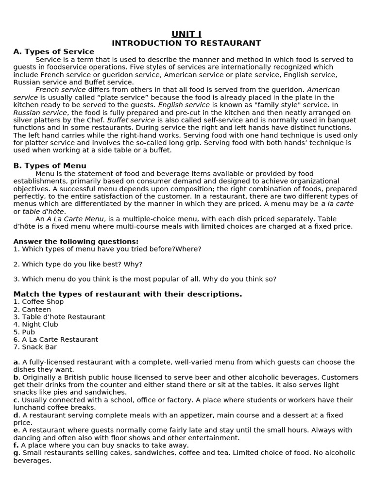 Introduction To Restaurant Service | PDF | Restaurants | Menu