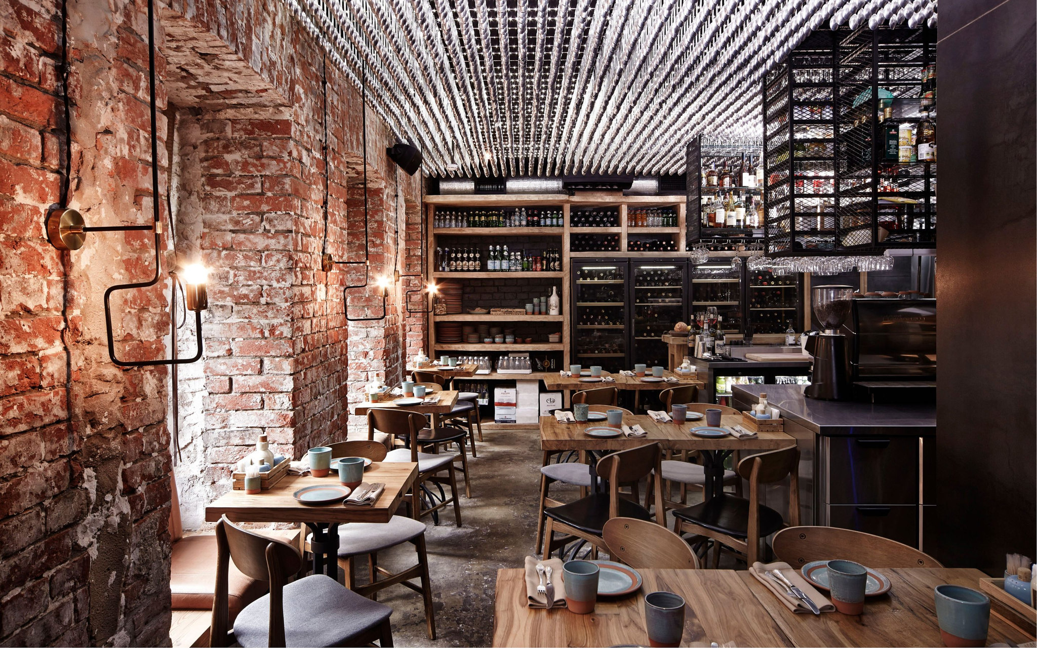 Lexica - A natural light modern restaurant, grape wine pots on wall ...