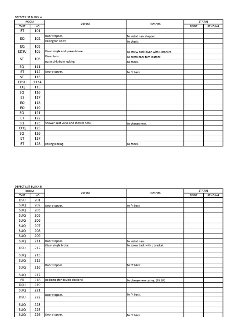 Defect List for Maintenance Tasks | PDF | Bathroom | Home & Garden