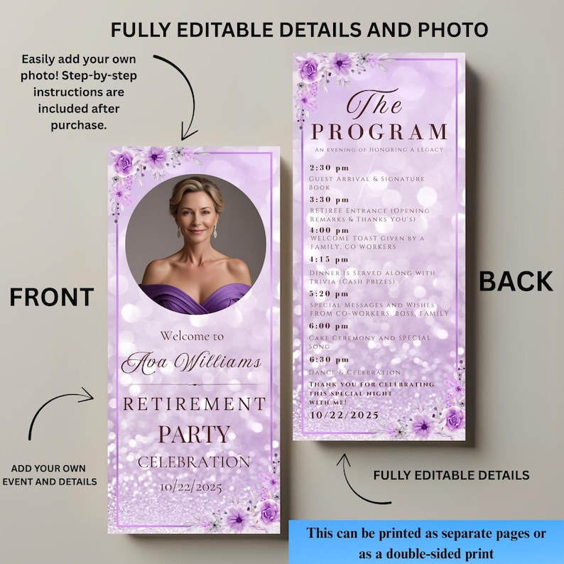Retirement Program Template Purple Program Card Printable Birthday ...