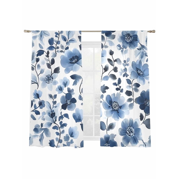 Blue Flowers Window Sheer Curtain Retro Spring Watercolor Floral Semi ...