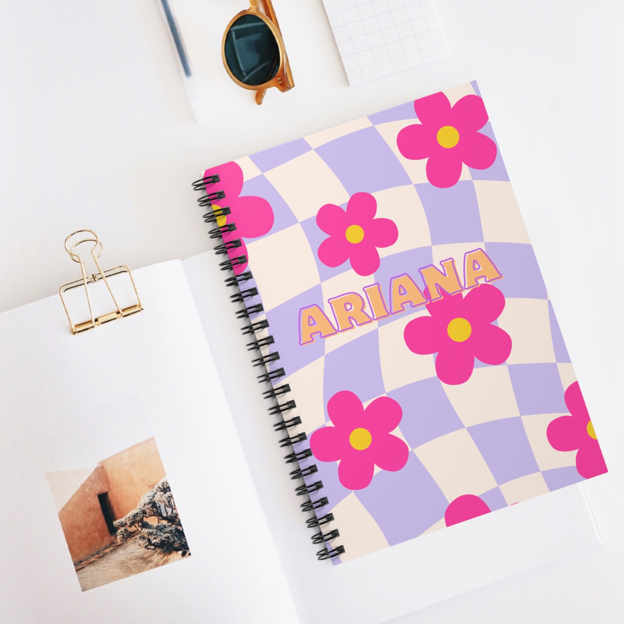 Personalized Spiral Notebook Retro Flower Checkered Pattern Flower ...