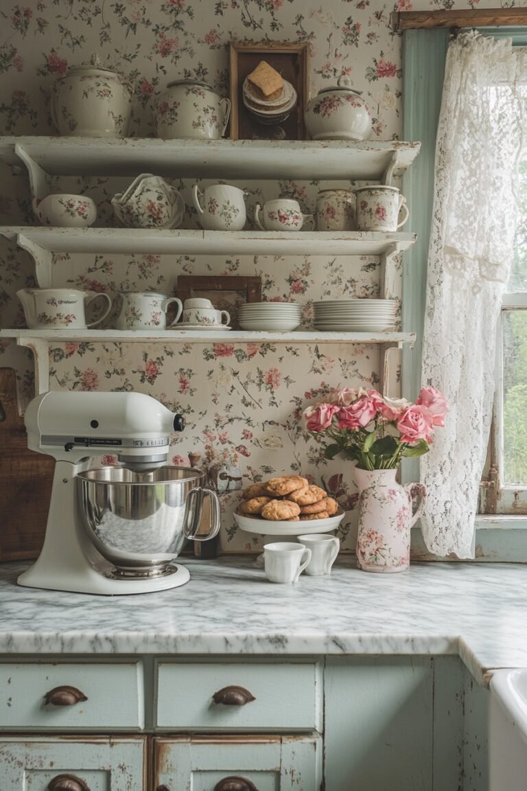 Vintage Farmhouse Kitchen Decor with Fresh Flowers and Vintage Ceramics