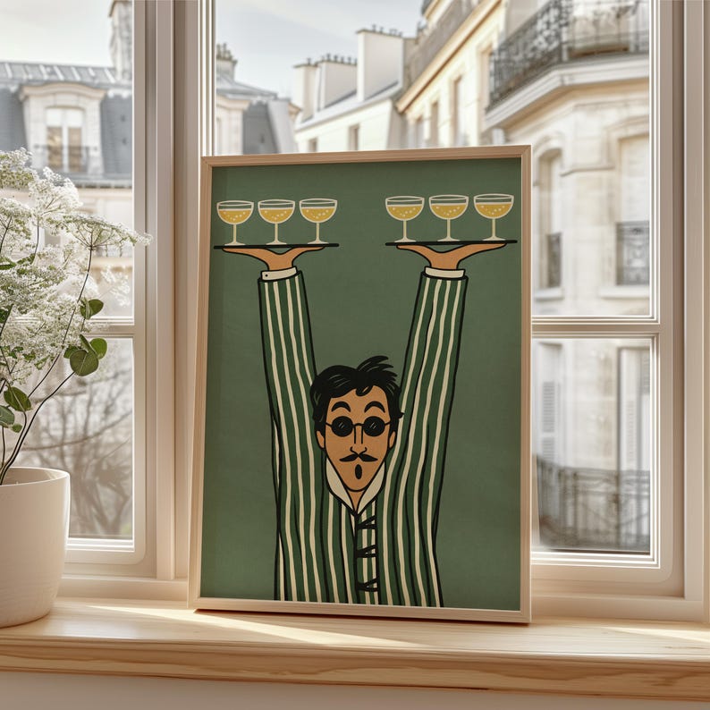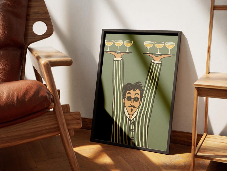 Minimalist Waiter Art Print, Retro Server Wall Decor, Wine Glasses Bar ...