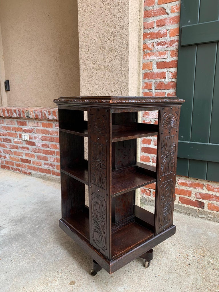 Antique English Carved Oak Revolving Rolling Bookcase Bookshelf Office ...