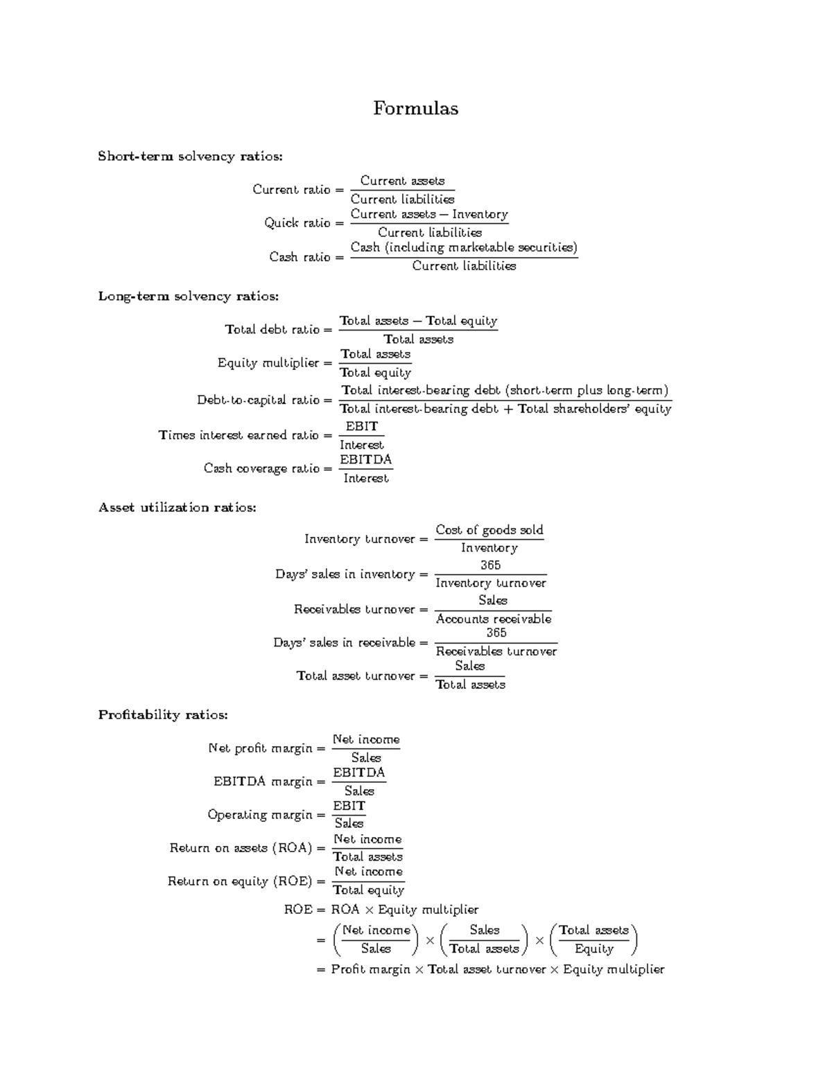 CB3410 Formula Sheet: Solvency, Profitability & Market Ratios - Studocu