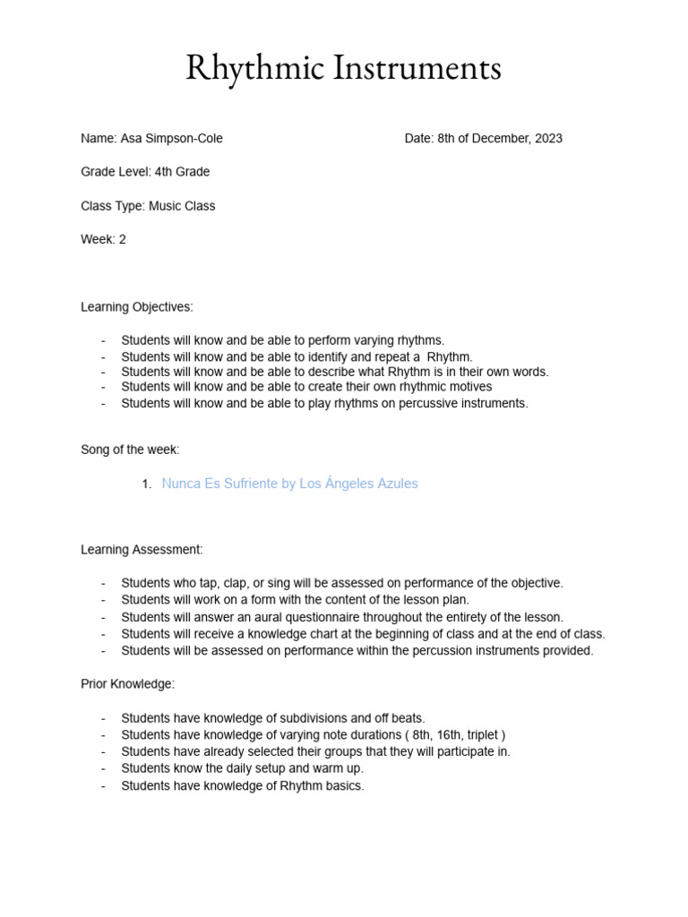 Lesson Plan For Rhythmic Instruments | PDF | Rhythm | Musical Notation