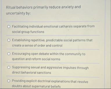 Solved Ritual behaviors primarily reduce anxiety and | Chegg.com