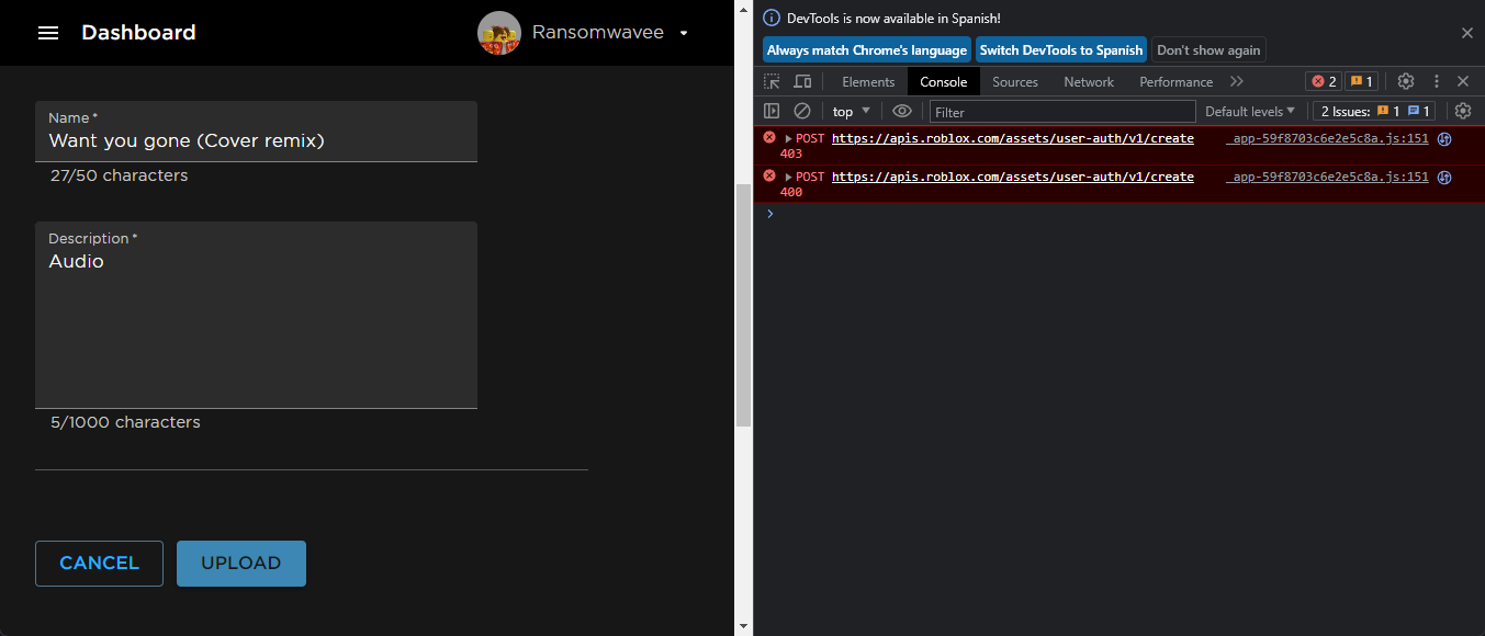 I can't upload audios in any way to roblox (Asset manager gives error ...