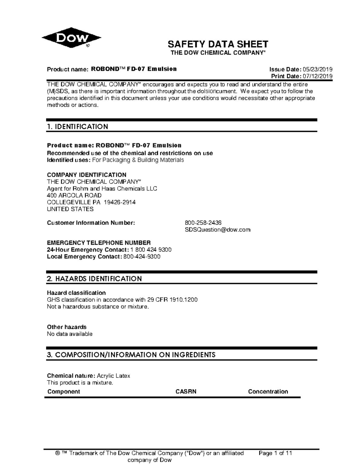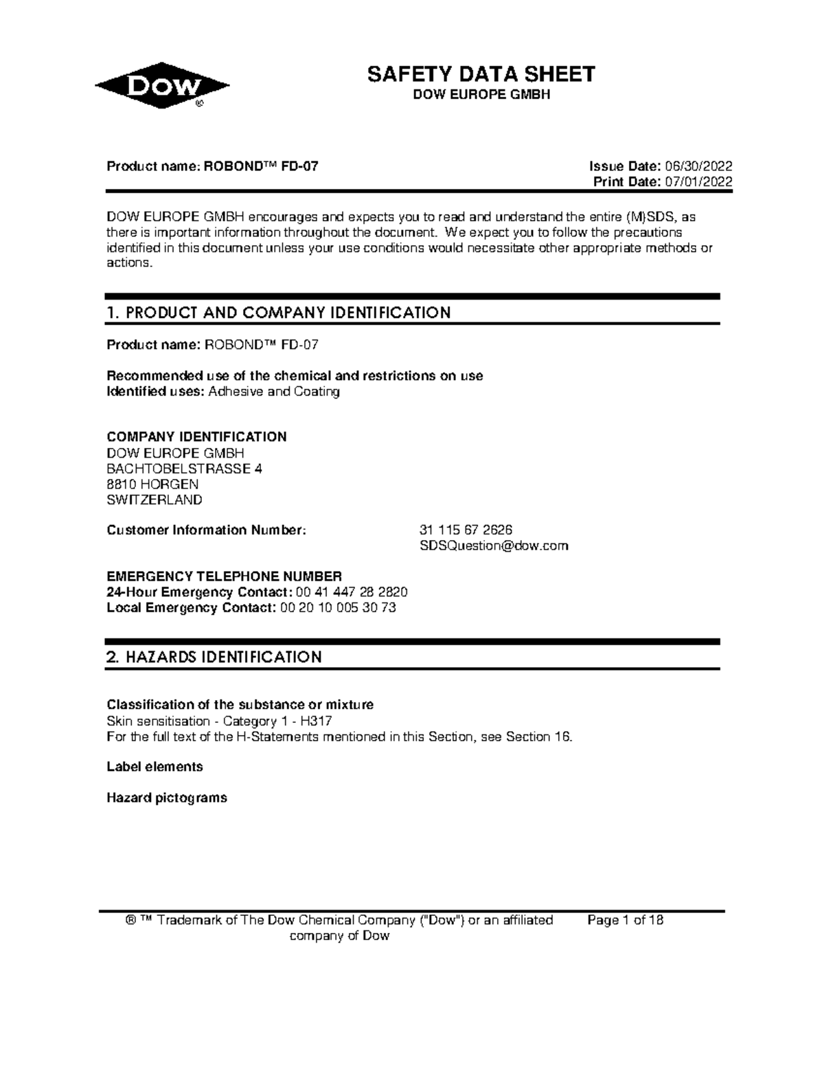 SDS- Robond™ FD-07-EG-EN - ® ™ Trademark of The Dow Chemical Company ...