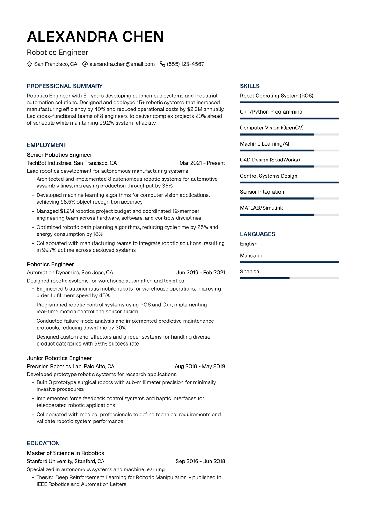 Robotics Engineer CV Example