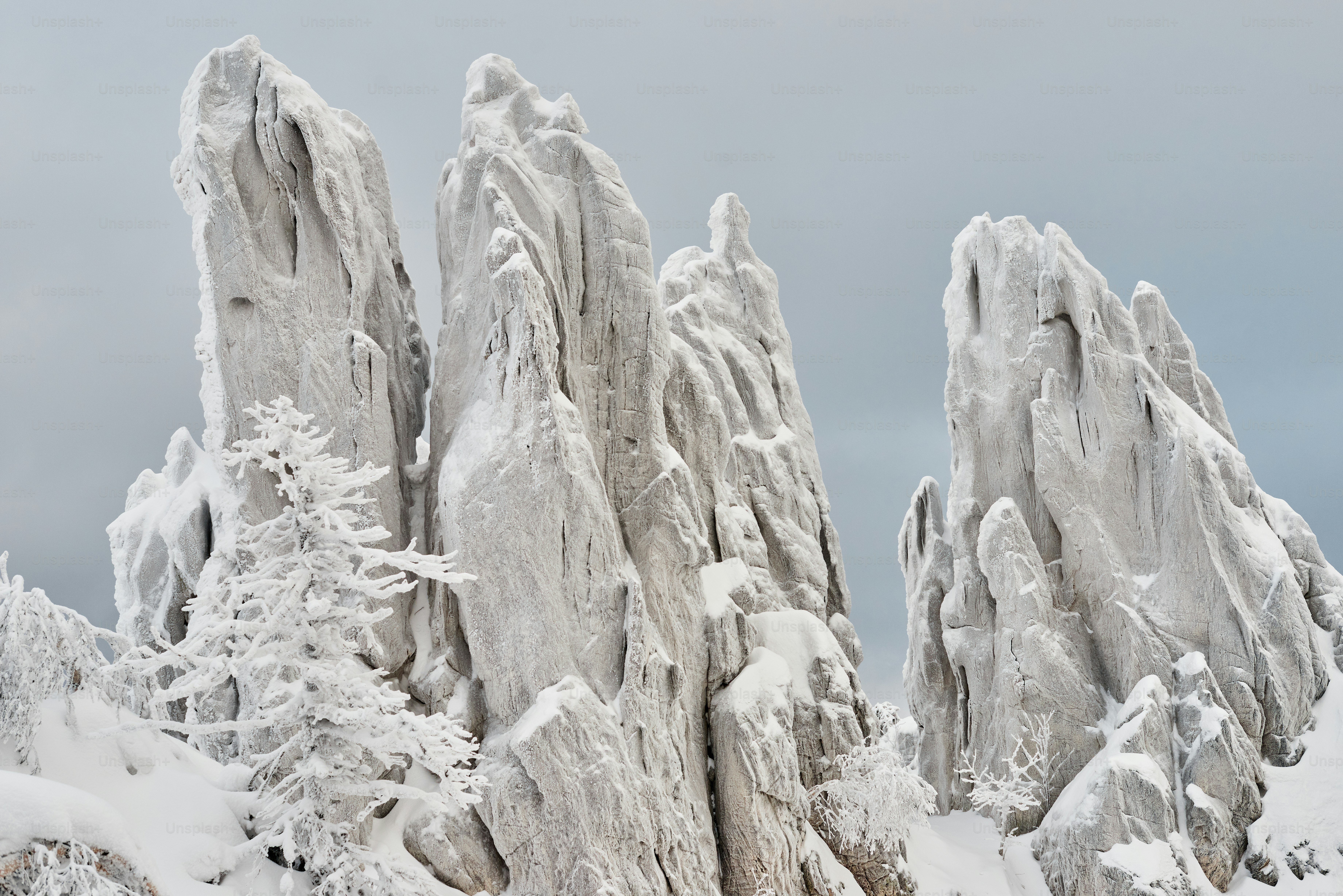 A group of rocks covered in snow next to trees photo – Taganay Image on ...