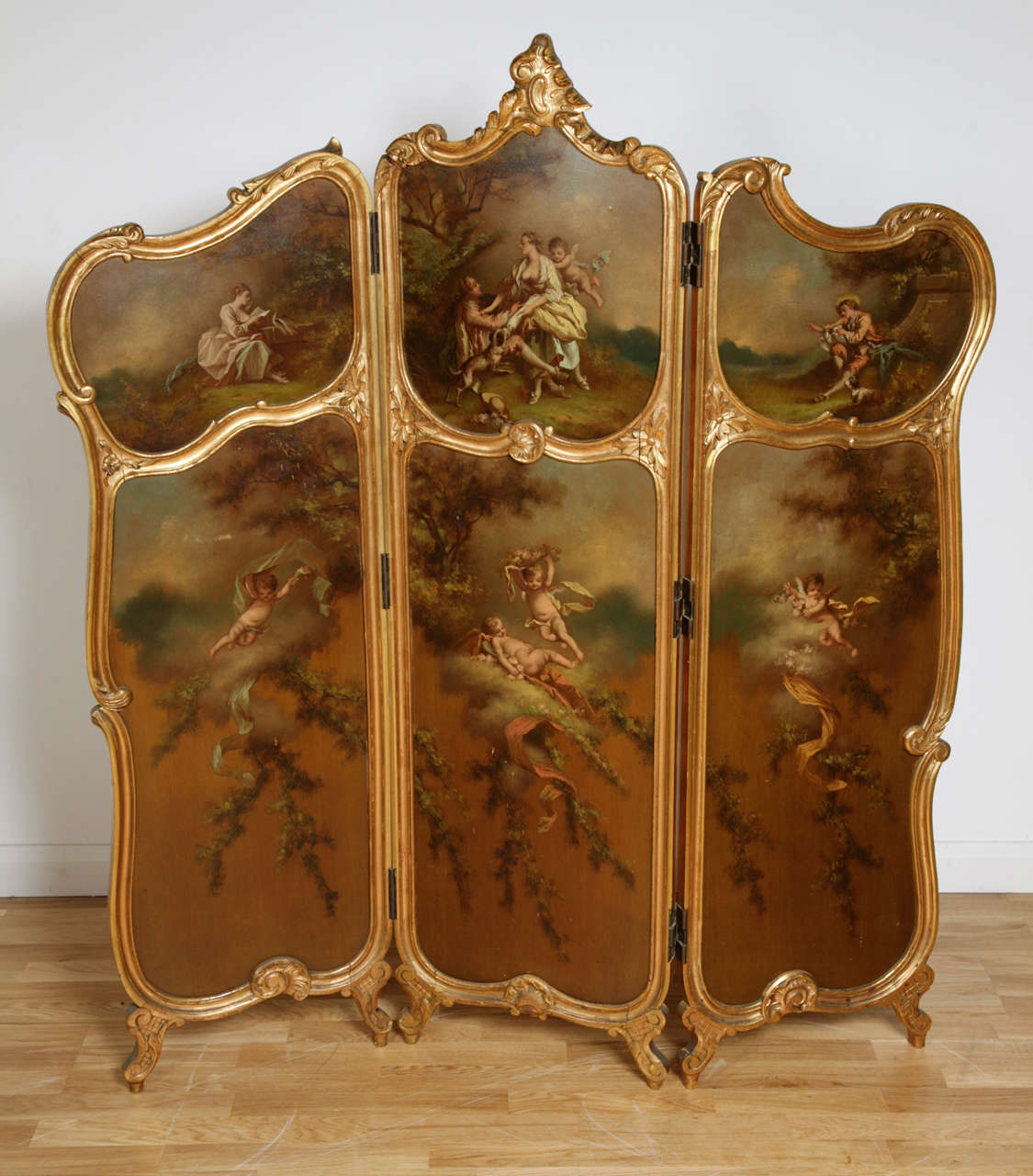 Rococo Style Parcel-Gilt and Painted Three-Fold Screen For Sale at 1stDibs