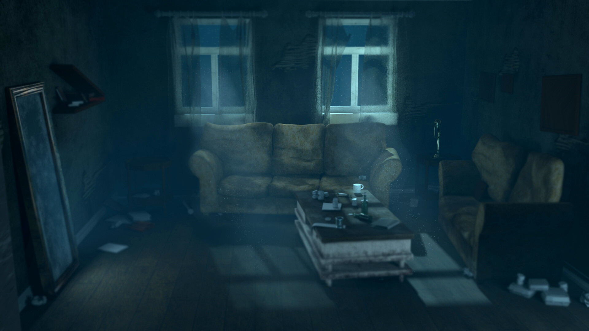 Download Dark, dusty room with a large, empty space. The room is filled ...