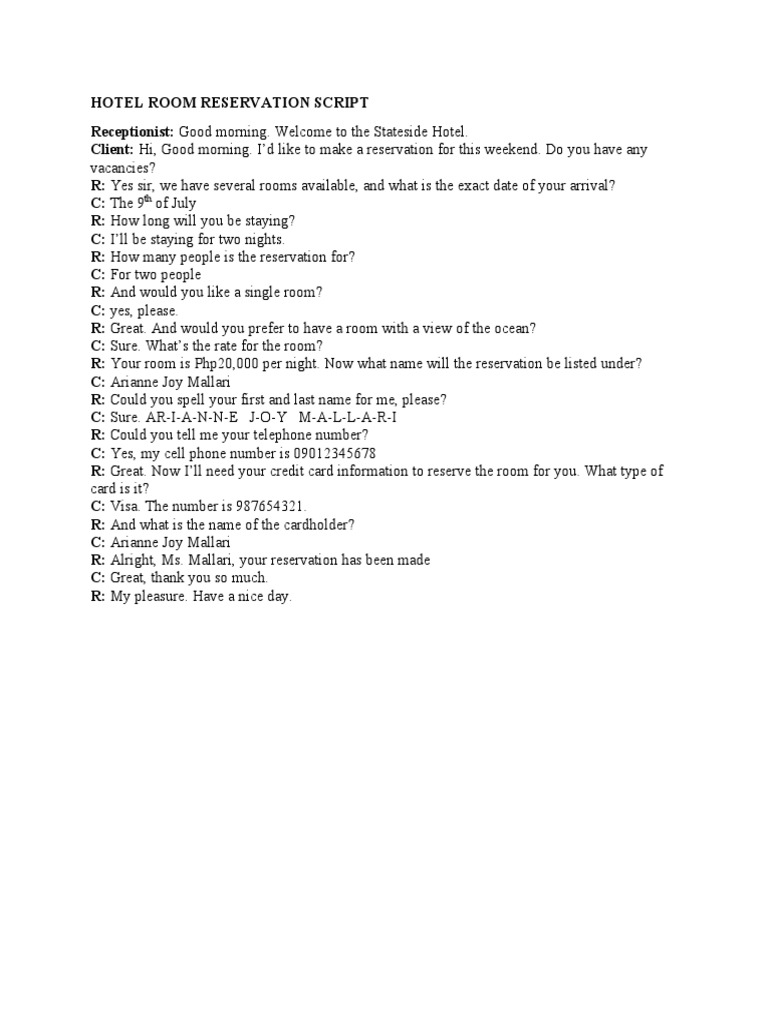 ROOM Service Script: Sample Telephone Conversation for Orders - Studocu