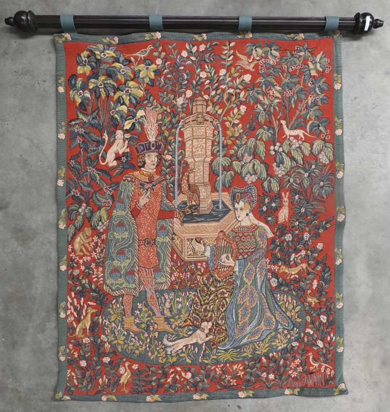 Een wandtapijt naar antiek voorbeeld. Met label ‘Le Roman De La Rose ...